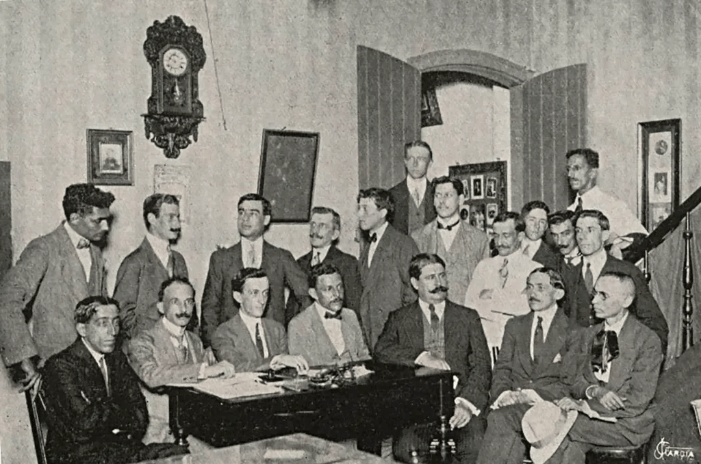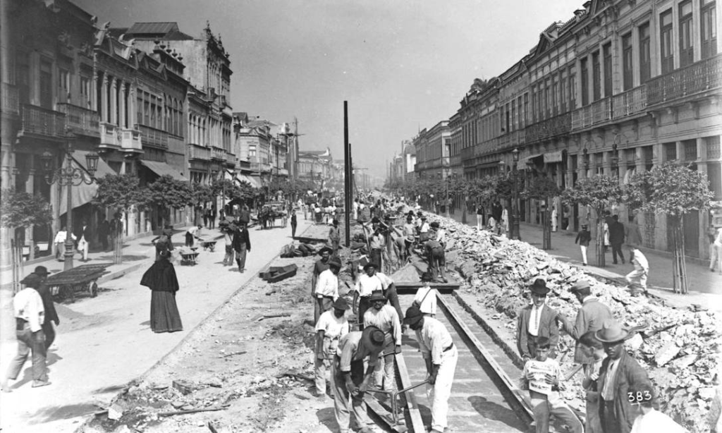 Operários ainda trabalhavam na Av. Marechal Floriano, em 1908.