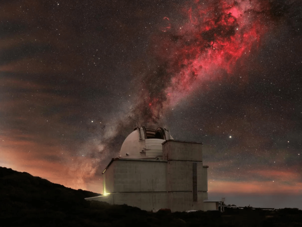 Esse é o Telescópio Isaac Newton, na extremidade das instalações do telescópio em La Palma, nas Ilhas Canárias, na Espanha. Acima está o braço de Cygnus, uma região no centro da Via Láctea conhecida pela formação de estrelas.