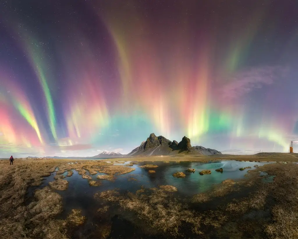 Tirada em Hvalnesviti, na Islândia, a imagem mostra a montanha Eystrahorn, com as luzes da tempestade KP7, uma tempestade geomagnética que pode causar auroras no céu e perturbar os sistemas de energia elétrica na Terra.