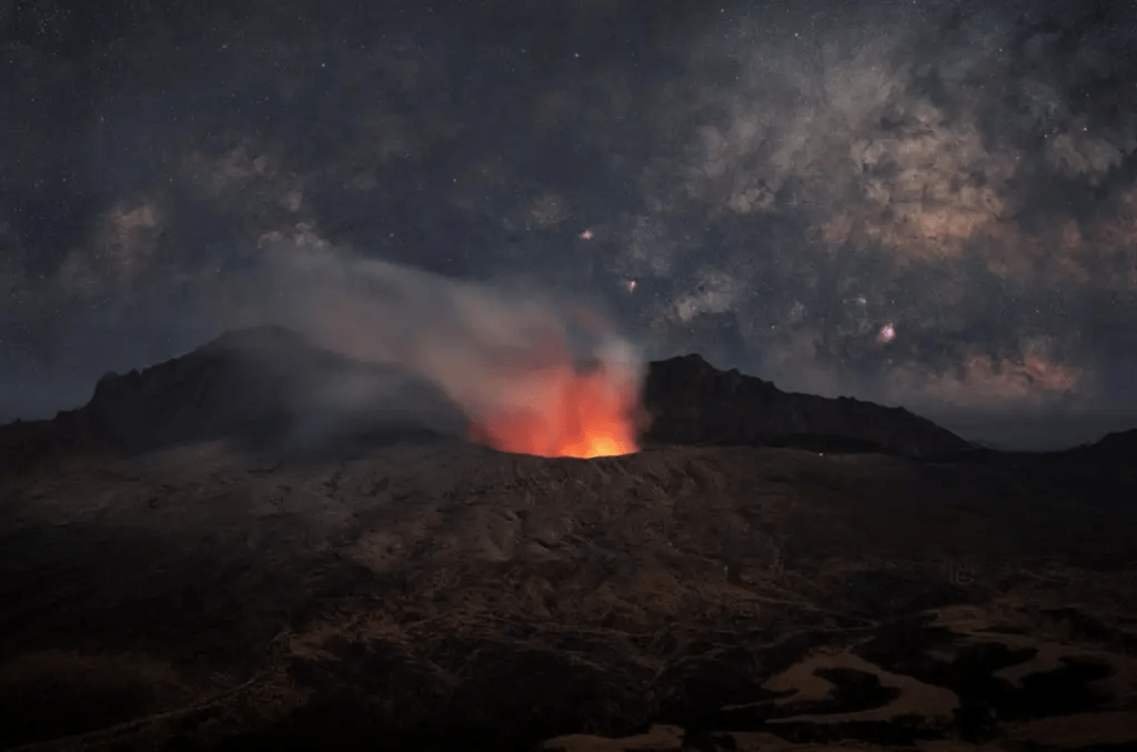 O Monte Aso, localizado na província de Kumamoto, é o nome coletivo dos cinco picos frequentemente chamados de Cinco Montanhas de Aso. Esta fotografia é composta com o primeiro plano e o céu fotografados separadamente, com a Via Láctea acima, e uma cratera vulcânica ativa do pico Nakadake abaixo.