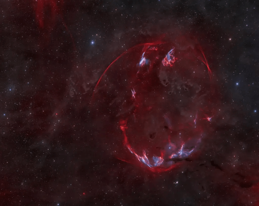 Com um fachos de luzes vermelhas, o SNR G156.2+5.7 é um tênue remanescente de uma supernova na constelação de Auriga. Ele está situado atrás das nuvens escuras do complexo molecular Touro-Auriga, próximas ao nosso Sistema Solar.
