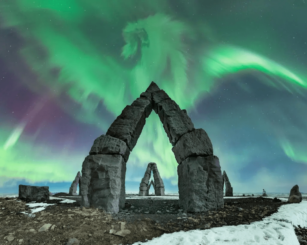 Esta foto foi tirada no Arctic Henge, em Raufarhöfn, uma das aldeias mais remotas ao norte da Islândia, onde o Círculo Polar Ártico fica próximo à costa. Uma tempestade geomagnética nível G2 gerou as luzes da aurora boreal em formato de dragão acima do portal.
