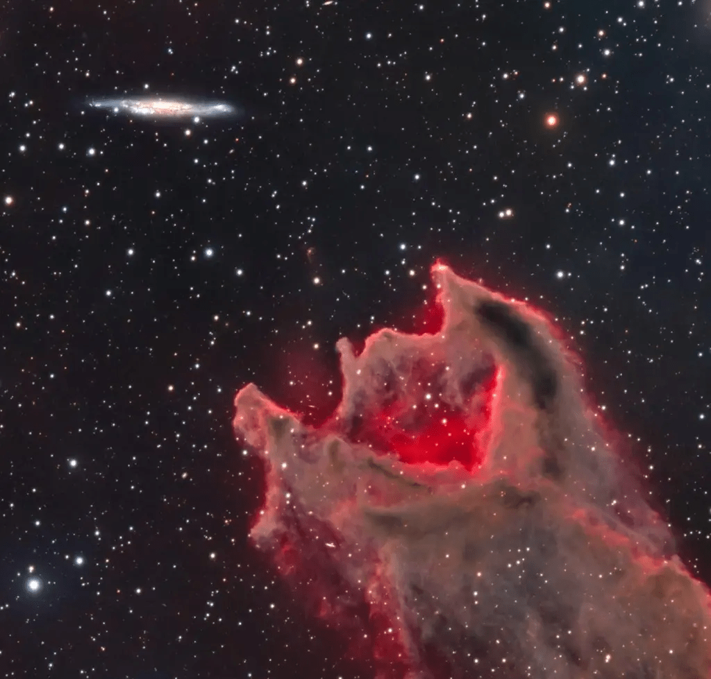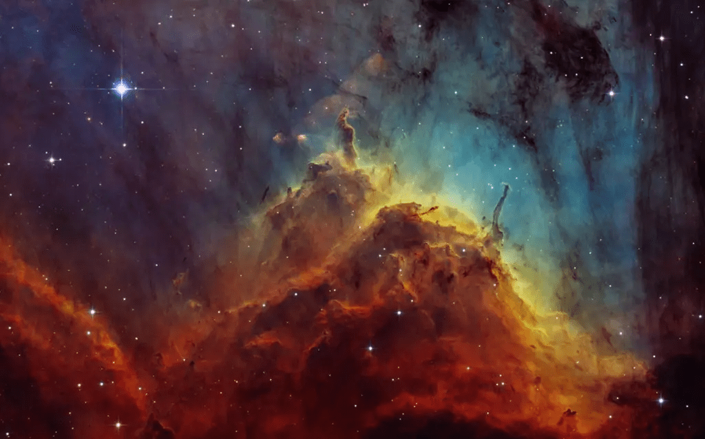 Esta imagem mostra um olhar de perto da IC 5070, conhecida como a Nebulosa Pelicano. De acordo com o autor, o nome veio por conta das estruturas finas de poeira e gás que lembram a névoa em montanhas atingidas pelo sol nascente.