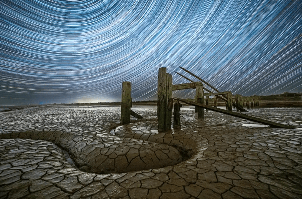 A foto ds aros de luz em contraste com a vala sinuosa e rachada do canal abaixo foi tirada na Praia de Snettisham, em Norfolk, no Reino Unido. A região é famosa por suas vastas planícies de maré que atraem aves migratórias em números impressionantes.