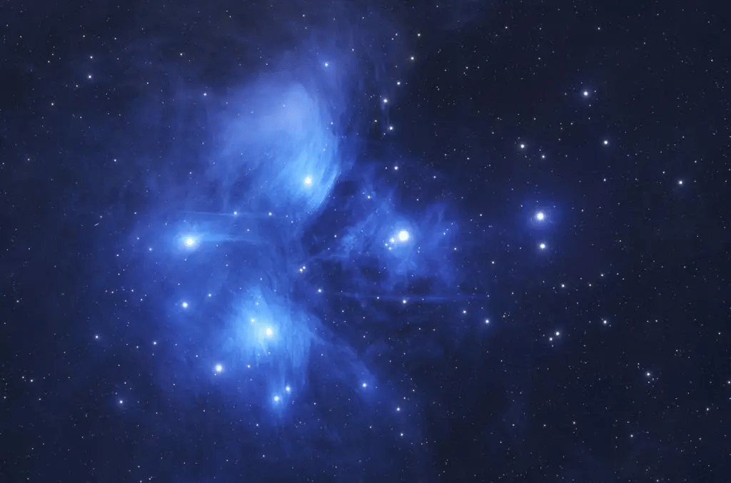 Também conhecido como “Sete Irmãs” ou M45, As Plêiades são um aglomerado aberto de estrelas localizado na constelação de Touro. Elas ficam a aproximadamente 444 anos-luz de distância da Terra, e o seu padrão de estrelas e luzes azuladas podem ser observadas a olho nu.