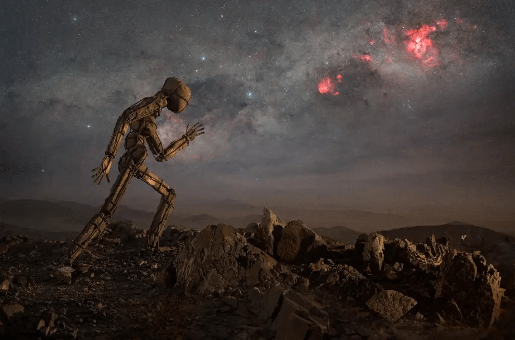 A escultura de pedra do homem correndo faz parte de um conjunto que contem outras estátuas, conhecidas como “Homens Solitários de Kaokoland”. Essa região fica no deserto ao noroeste da Namíbia, e dela é possível ver o céu limpo à noite, como o braço Carina da Via Láctea na foto.