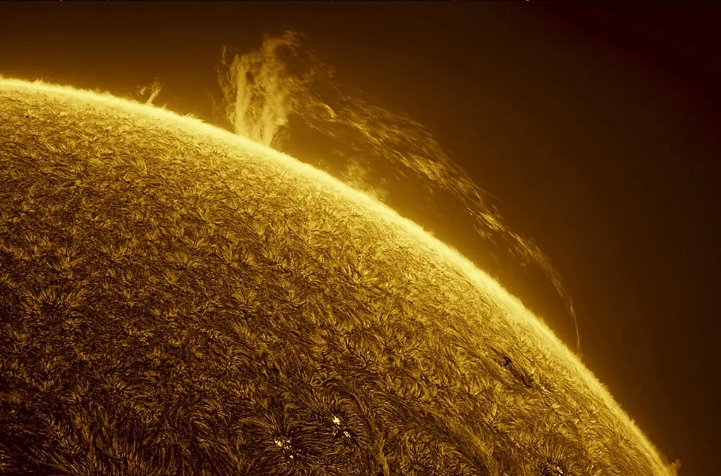 Esta é uma imagem estática de uma sequência de time-lapse que apresenta a atividade da cromosfera solar, com uma proeminência de erupções de plasma em movimento. Esta proeminência é tão grande que sua largura é maior que a largura dos anéis de Saturno.